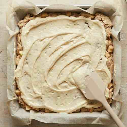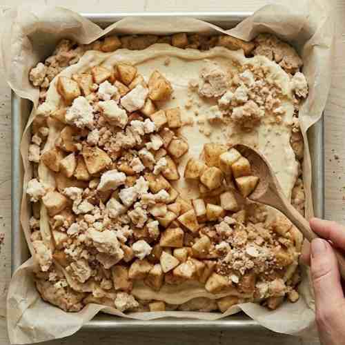 Spread the apple mixture gently over the cheesecake layer. Distribute the apples evenly so each slice has a balanced amount.