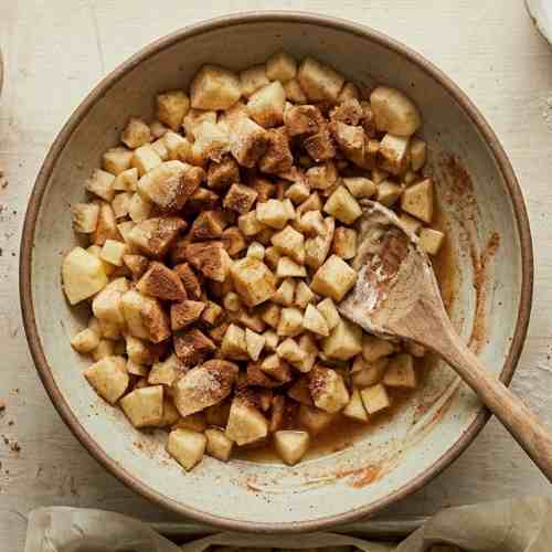 In a separate bowl, combine the diced apples, sugar, cinnamon, nutmeg, and lemon juice. Mix until the apples are evenly coated.