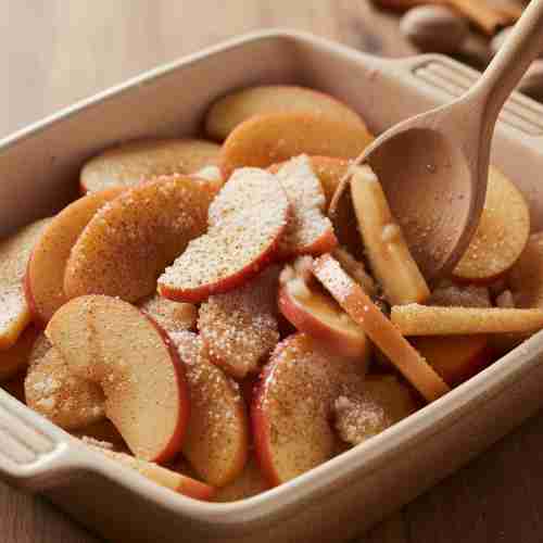 - Spread apples in an 8×8 baking dish or similar size.