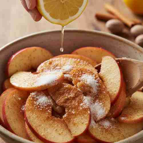 - Mix apples with lemon juice, sugar, cinnamon, nutmeg, and flour until coated.