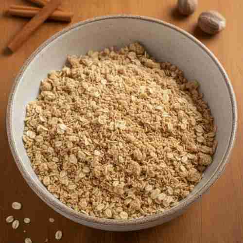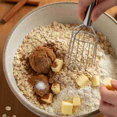 - Combine oats, flour, brown sugar, cinnamon, and salt. Add cold butter and crumble it in using your fingers.