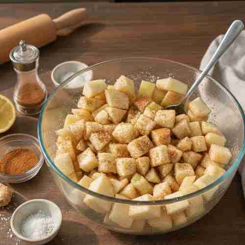 Wash the apples well, then peel them completely. Remove the cores and cut the apples into small, even cubes. Keeping the pieces similar in size helps the apples cook evenly while baking.