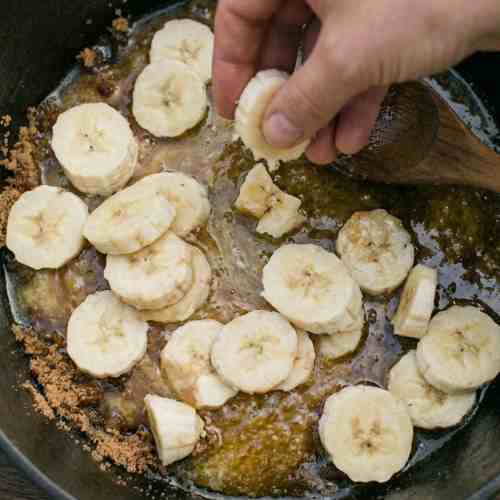 Place your Dutch oven over a bed of hot campfire coals. Let it heat for a few minutes before adding anything. This helps the butter melt quickly and keeps the bananas from sticking.