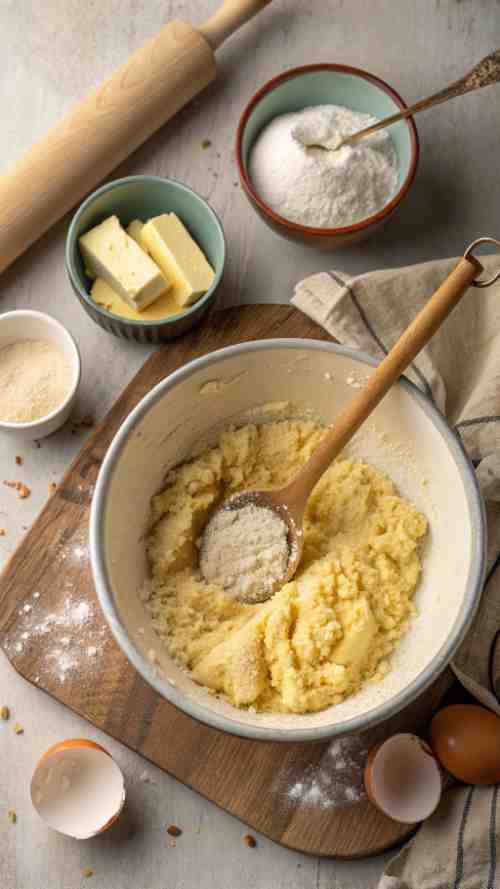 Now, let’s make that buttery, melt-in-your-mouth crust. In a large mixing bowl, beat the softened butter and sugar together until it’s smooth and fluffy. This takes about a minute, and yes, it’s an arm workout.