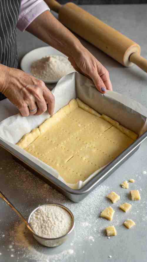- Press the dough evenly into the bottom of the prepared pan.