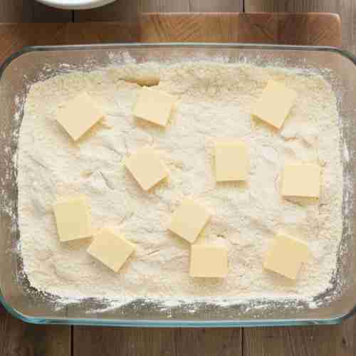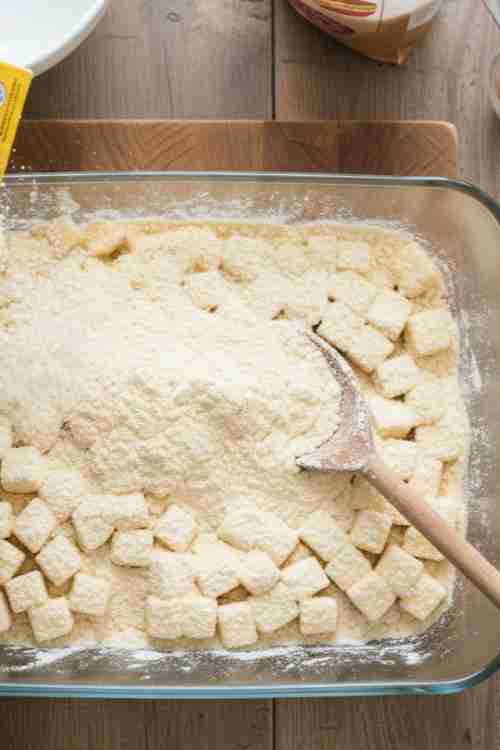 - Sprinkle dry cake mix over the apples. Scatter slices of butter on top of the cake mix.
