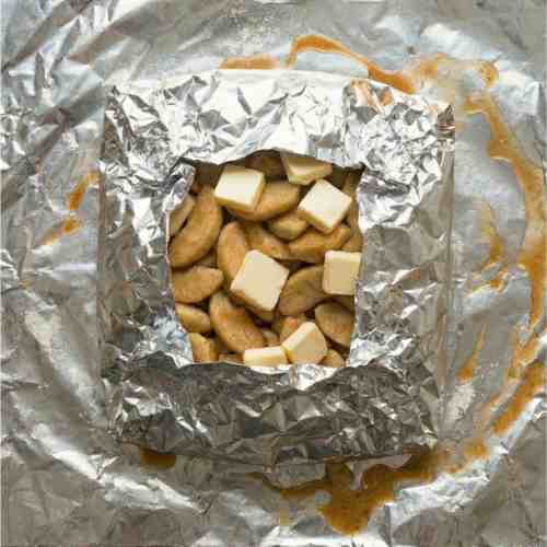 Tear off large squares of aluminum foil, about 10 to 12 inches wide. Each packet needs enough space to hold the filling and still fold closed.