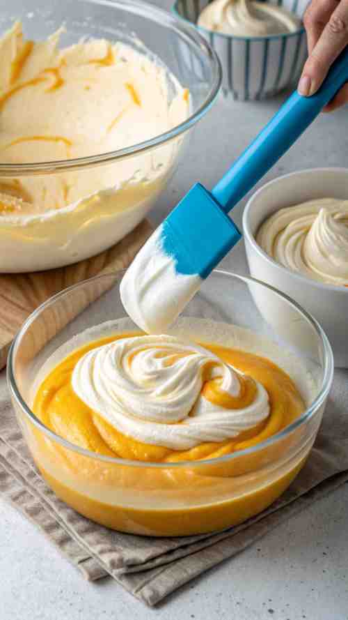 Take your mango puree and gently fold it into the whipped cream. Don’t mix it aggressively—this is a mousse, not a smoothie. Light, gentle folds will keep it fluffy and airy. If you used gelatin, you’ll notice it thickening up as you mix.