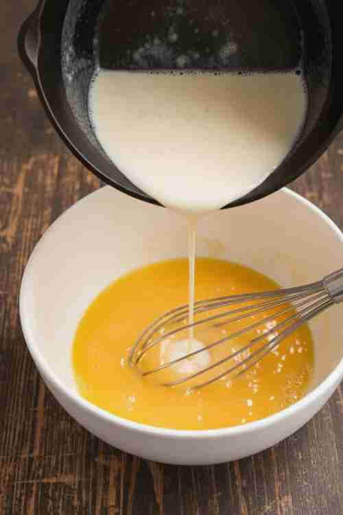 - Slowly pour a little of the warm cream into the egg mixture, whisking constantly.