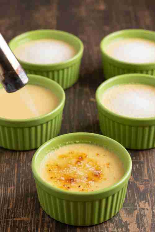 - Before serving, sprinkle a thin, even layer of sugar over each custard.