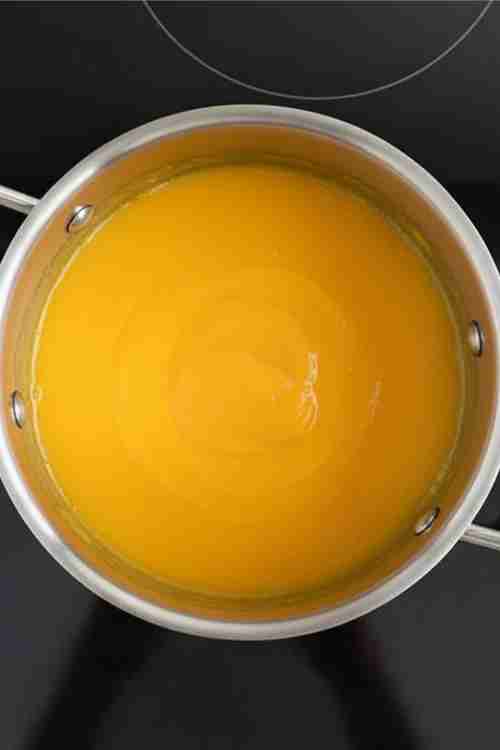 - Remove from heat and stir in butter until fully melted. Strain the curd through a fine-mesh sieve into a clean bowl to remove any lumps.