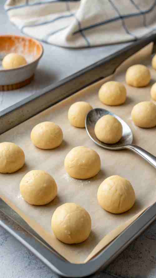 - Roll the dough into tablespoon-sized balls and place them on the baking sheet, leaving a little space between them.
