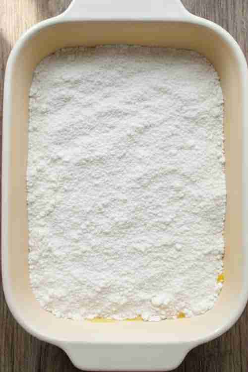 - Sprinkle the dry cake mix evenly over the lemon filling—do not stir!