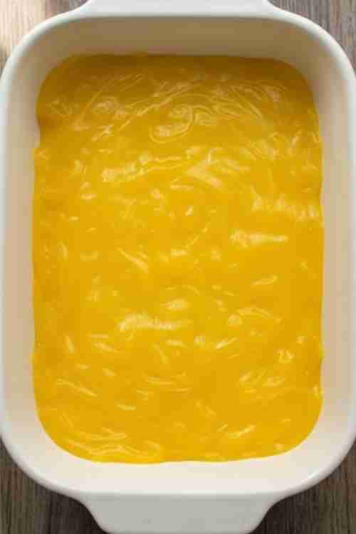 - Evenly spread the lemon pie filling in the bottom of the dish.