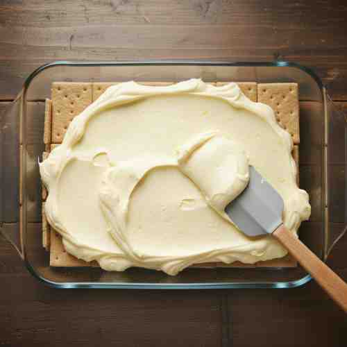 Now comes the fun part. In a 9×9 inch pan, lay down a layer of graham crackers. Spread a layer of the lemon cream over the crackers. Repeat layers until you run out of crackers and cream. End with the cream on top. If any crackers break, don’t worry, just gently press them into the cream—they’ll soften in the fridge.