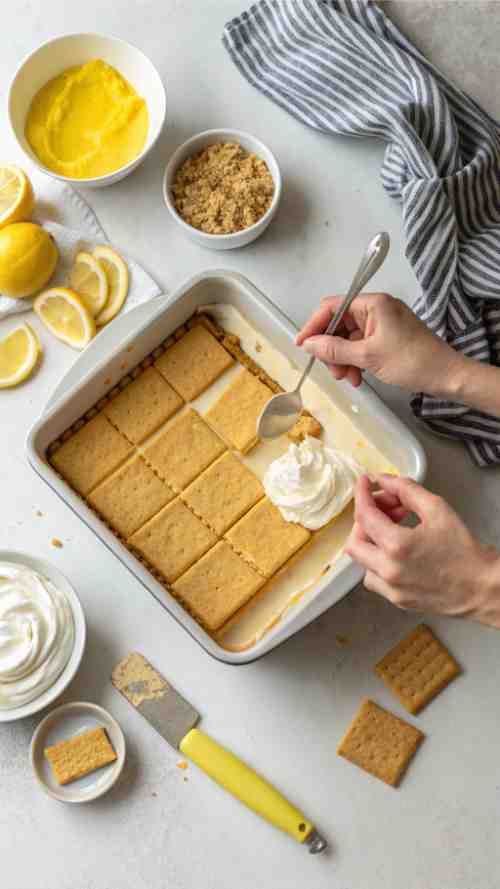 - Repeat with another layer of graham crackers, the rest of the lemon mixture, and then more whipped cream on top.
