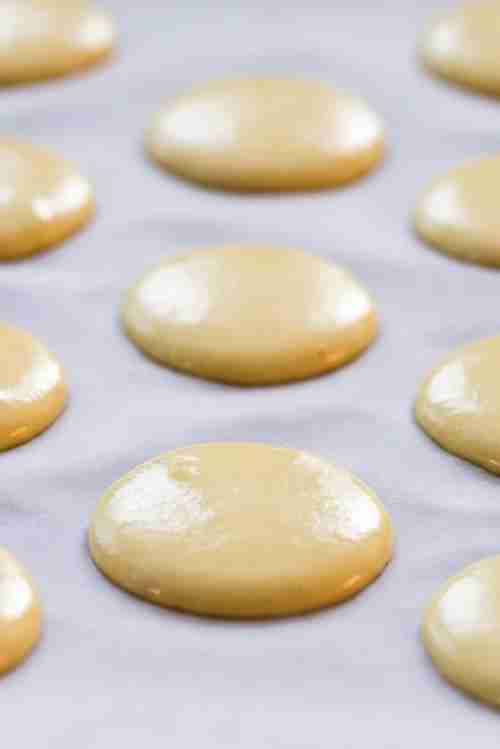 Scoop your batter into a piping bag with a round tip and pipe little circles onto your baking sheet. Try to keep them the same size—I use a macaron template under my parchment paper because I have zero ability to freehand anything.