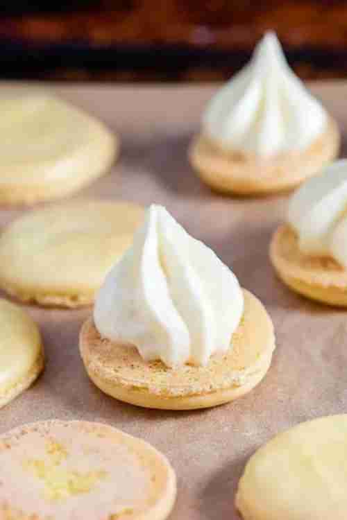 - Pair up macaron shells, pipe buttercream on one side, and sandwich together.