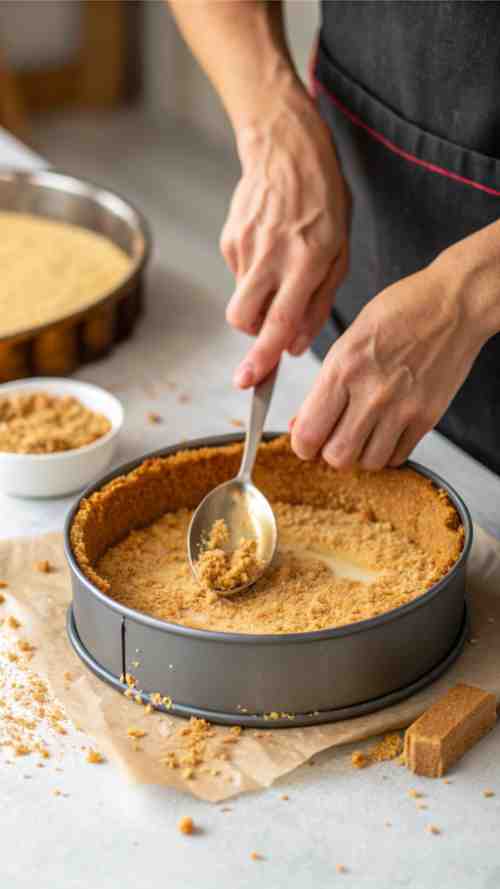 Dump the mixture into a 9-inch springform pan and press it down firmly. You can use the back of a spoon, a measuring cup, or your fingers if you’re feeling messy. The goal is a nice, packed-in crust.