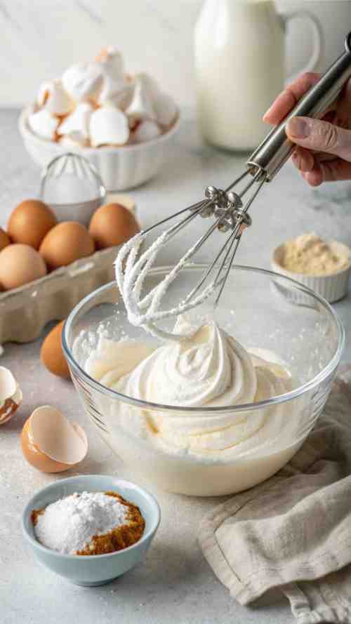 Gradually add the sugar, one spoonful at a time, and keep beating until stiff peaks form. If you lift the beater and the meringue stands up like a little mountain, you nailed it.