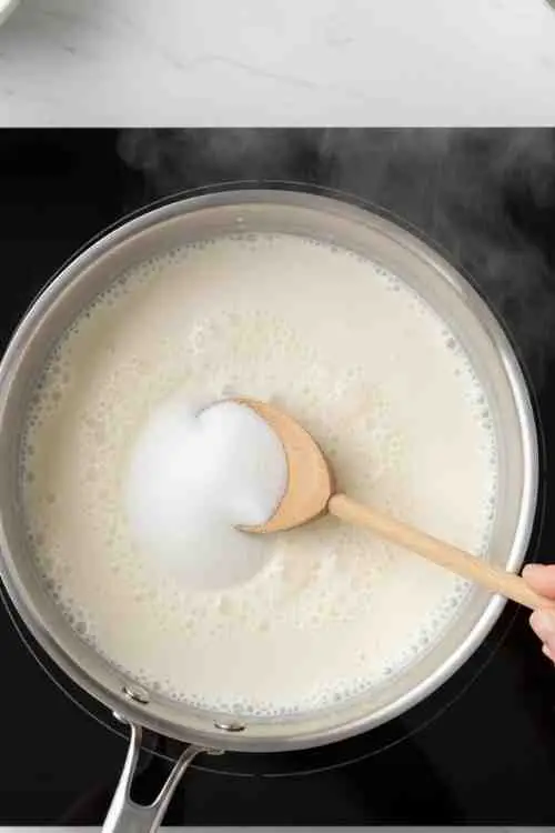 Grab a medium-sized saucepan and pour in the heavy cream and sugar. Turn the heat to medium and stir it every so often. You want the sugar to fully dissolve and the cream to start simmering.