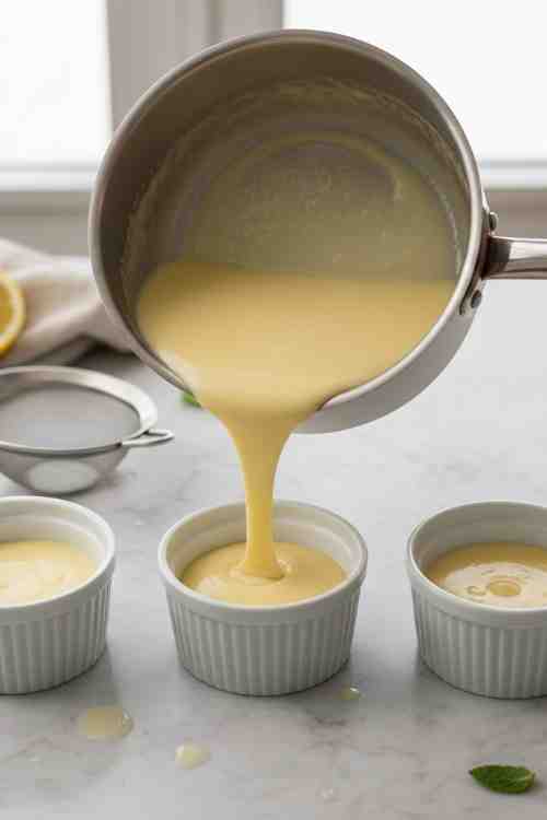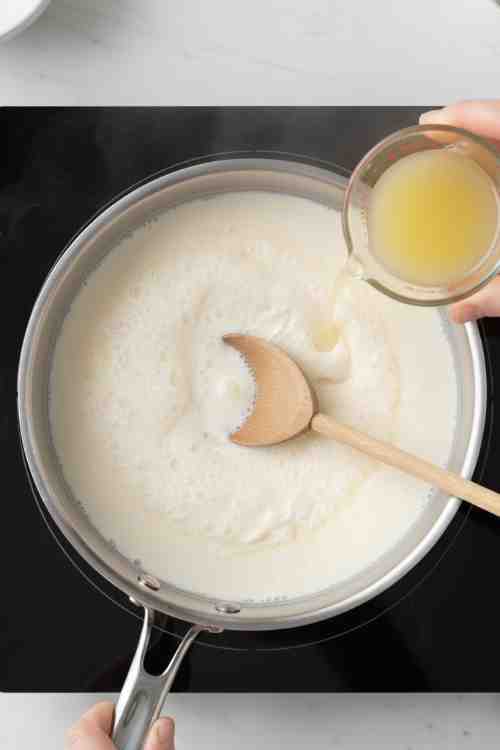 After your three minutes are up, take the pan off the heat. Pour in the fresh lemon juice and give it a good stir. You’ll notice something wild—almost instantly, the cream starts thickening. It’s like a little science experiment, except instead of making slime, you’re making dessert.