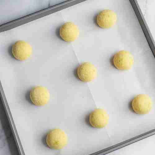 - Scoop about 1 tablespoon of dough, roll into a ball, and coat in granulated sugar.