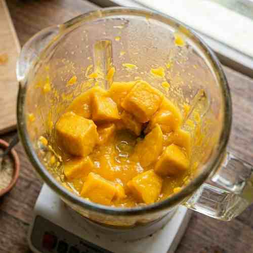 If using fresh mango, peel and cut into small chunks. Make sure to remove the seed. Measure about two cups of mango pieces. If using frozen mango, measure directly and allow it to sit for a few minutes so it softens slightly. This helps with smoother blending.