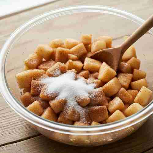 - Mix chopped apples, sugar, cinnamon, and lemon juice in a bowl.