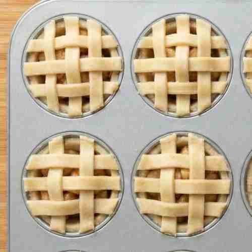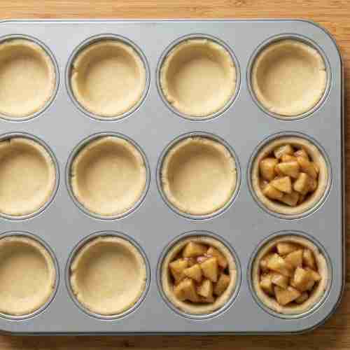 Finally, gently press each dough circle into the wells of a muffin tin, making sure it fits snugly against the bottom and sides. Fill each mini crust with your prepared apple filling. You can then add a top crust of your choice before baking!