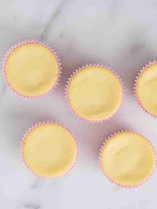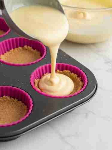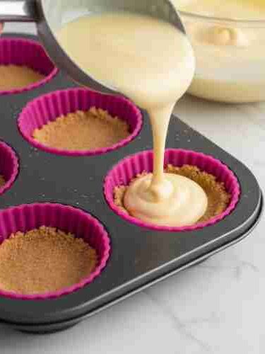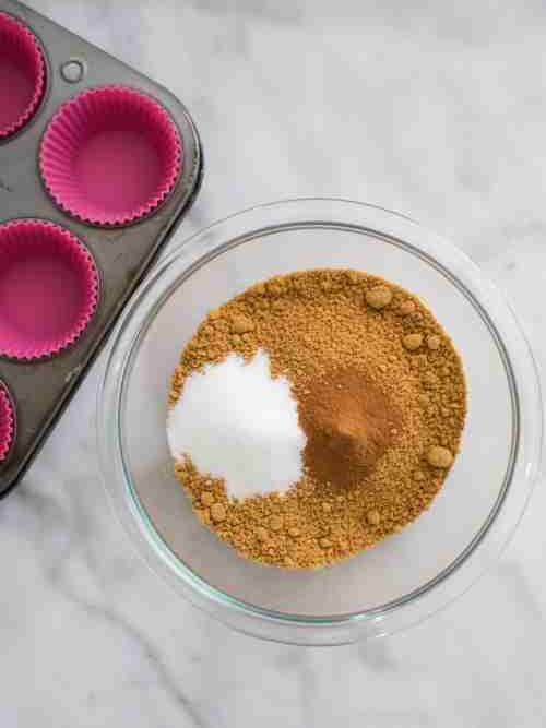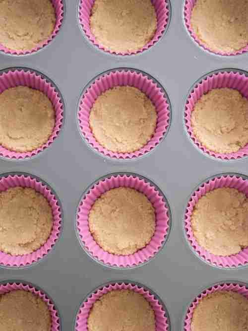 - Line a muffin tin with cupcake liners and press about 2 tbsp of crust mixture into each cup.