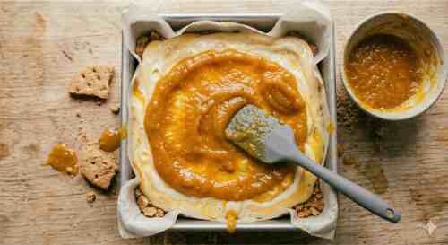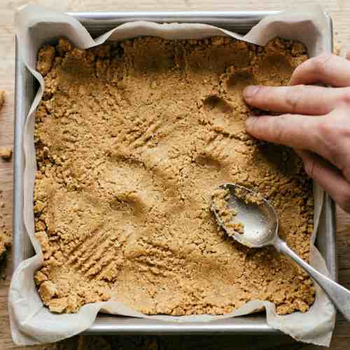 Transfer this mixture into a lined square pan. Press it down firmly using the back of a spoon or a flat glass. Make sure the crust is even and tightly packed so it does not crumble later.