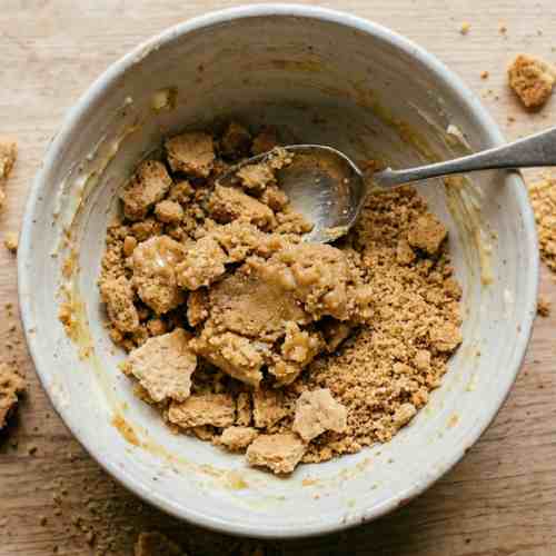 Add melted butter to the crumbs and mix well until all the crumbs are evenly coated. The mixture should feel like wet sand and hold its shape when pressed.