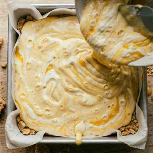 Gently pour the mango topping over the cheesecake layer.