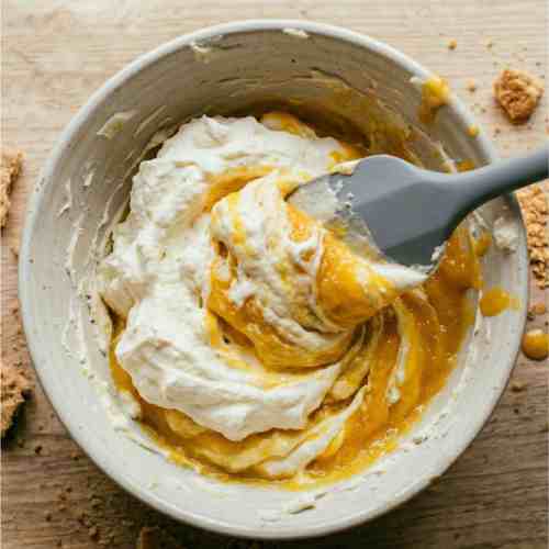 Gently add the whipped cream into the mango cheesecake mixture.