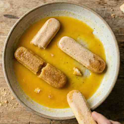 - Pour mango juice into a shallow bowl. Dip each ladyfinger biscuit quickly for about one second. Make sure they are lightly soaked but not too soft.