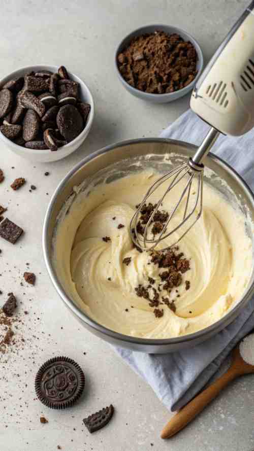 - Stir in sour cream, then gently fold in crushed Oreos.