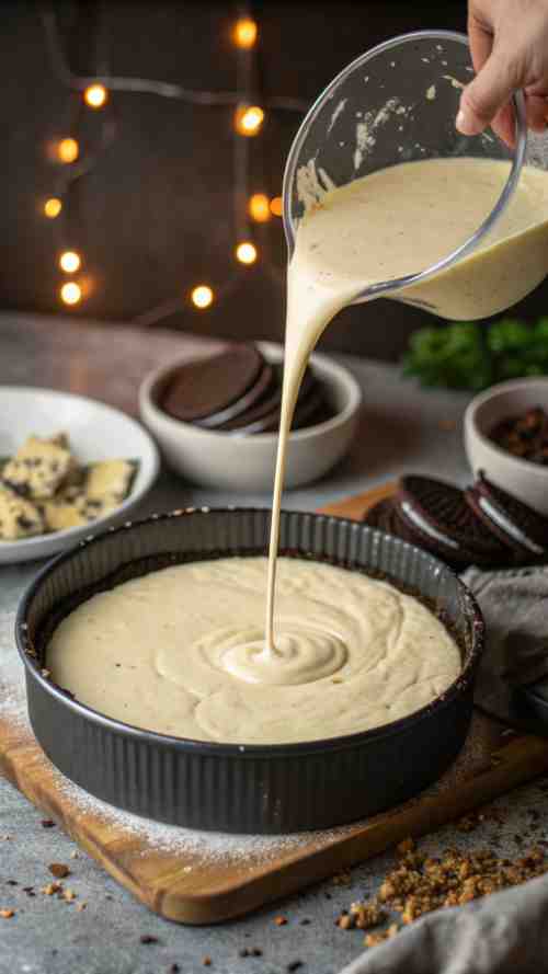 - Pour the cheesecake filling over your Oreo crust and smooth out the top.