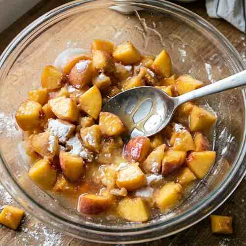 - In another bowl, mix diced peaches, sugar, lemon juice, and cornstarch. Stir gently until the peaches are evenly coated and the mixture looks slightly thick.