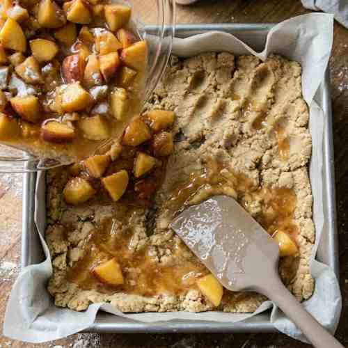 Pour the peach filling over the prepared base layer. Spread it evenly using a spoon or spatula so every bite has fruit. Try to distribute the peaches evenly across the pan.
