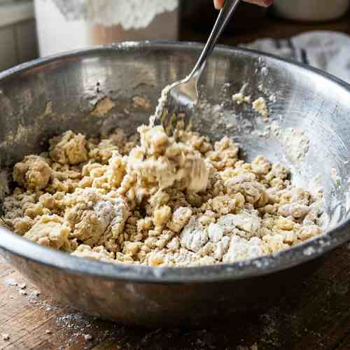 - Add melted butter and the egg to the dry mixture. Stir using a fork or spatula until a crumbly dough forms. The mixture should resemble coarse crumbs and hold lightly when pressed.