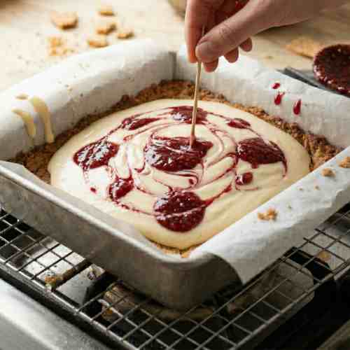 Using a toothpick or knife, gently drag through the raspberry mixture to create a marbled effect. Avoid overmixing to keep the swirl pattern visible and defined.