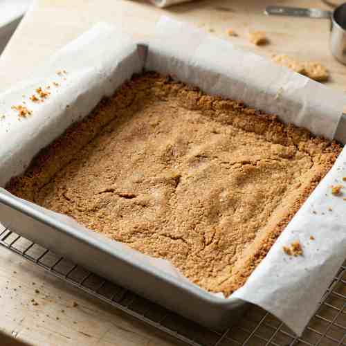 - In a bowl, mix graham cracker crumbs, melted butter, and sugar until evenly combined. Press the mixture firmly into the bottom of the prepared pan to form an even crust layer.