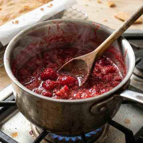 - In a small saucepan, combine raspberries, sugar, and lemon juice. Cook over medium-low heat until the raspberries break down into a sauce. Mash gently and allow to cool. Strain if a smoother texture is preferred.