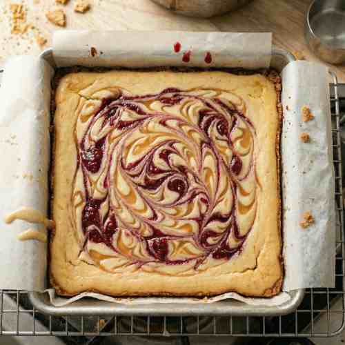 These raspberry cheesecake bars offer a smooth texture with a balanced sweet and tangy flavor. The combination of a firm crust, creamy filling, and fruit swirl creates a dessert that is both simple and visually appealing.