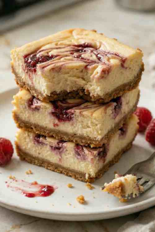 These raspberry cheesecake bars are a simple baked dessert with a rich, creamy texture and a bright fruit flavor. They combine a buttery crumb crust with a smooth cheesecake layer and a light raspberry swirl on top.