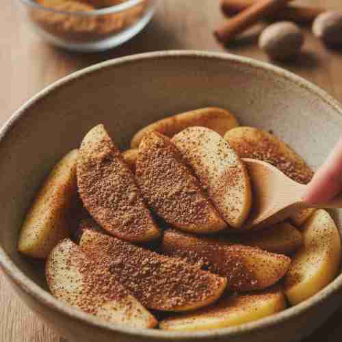 - Place the sliced apples in a large bowl. Add white sugar, brown sugar, flour, cinnamon, nutmeg, salt, vanilla, and lemon juice. Toss everything together until the apples are well coated. This is where it already starts smelling really good.