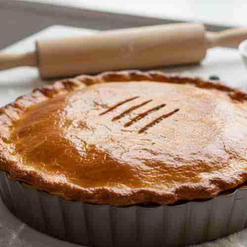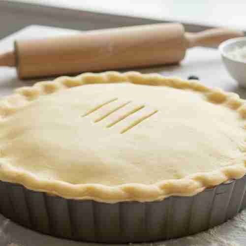- Place the top crust over the filling. Trim and crimp the edges. Cut a few slits on top so steam can escape. If you want, brush with egg wash for a golden finish.