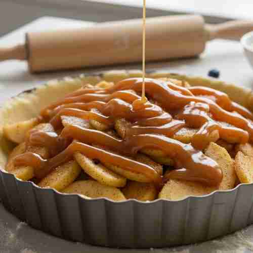 - Add half of the apple mixture into the crust. Drizzle some of the caramel sauce over the apples. Add the remaining apples, then drizzle more caramel on top. I usually add extra because no one has ever complained about too much caramel.