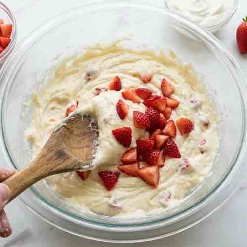 Using a spatula, gently fold the strawberries into the batter until they are evenly distributed.